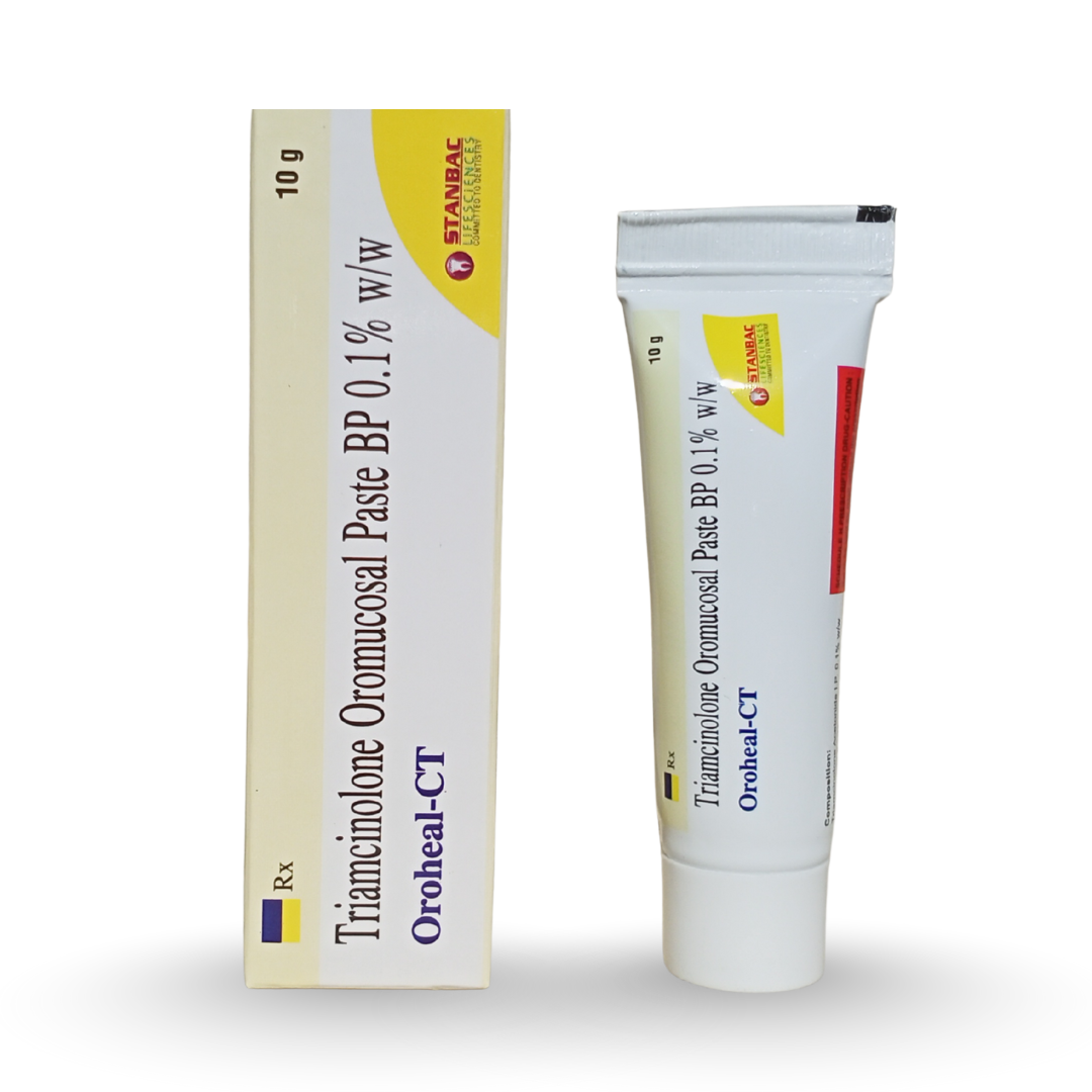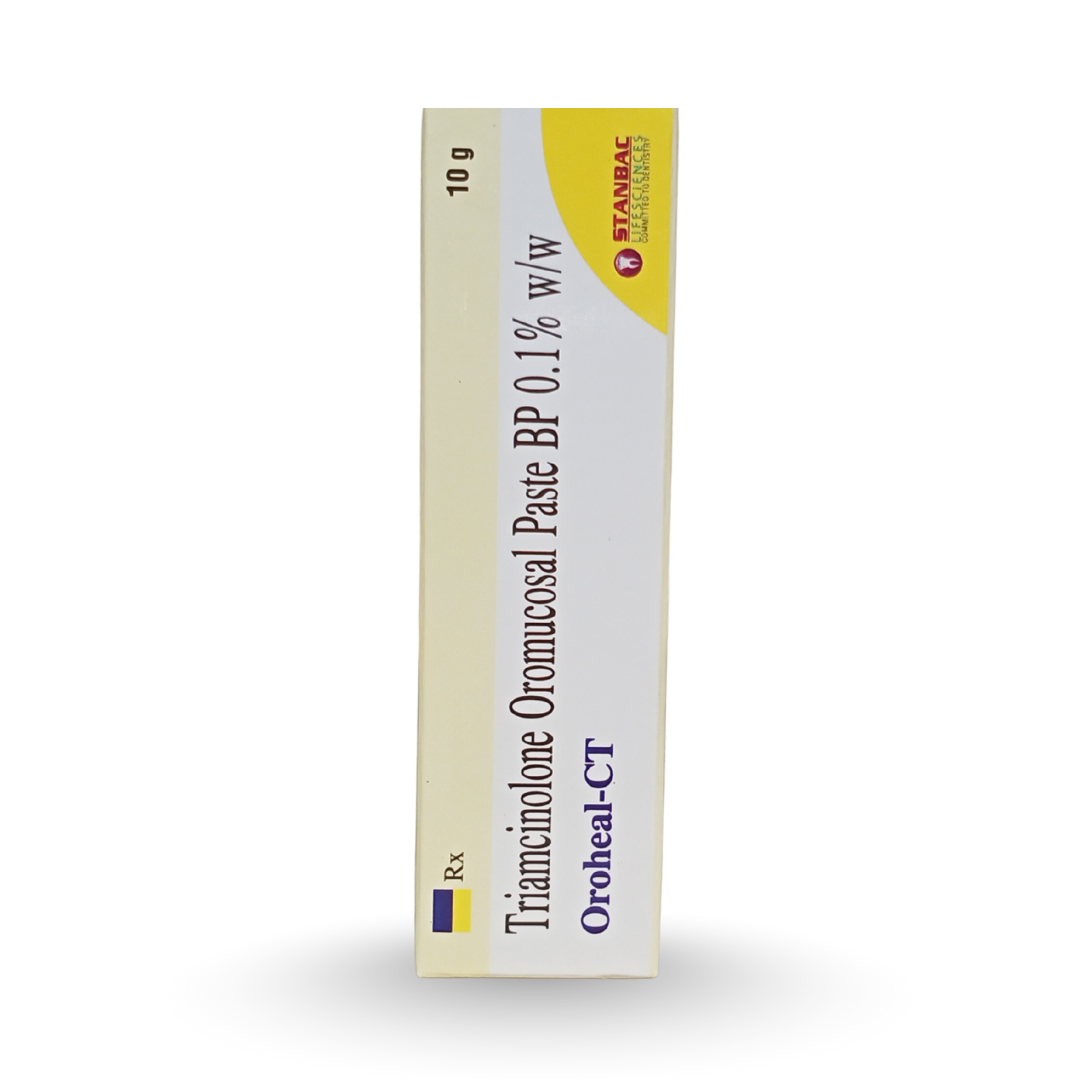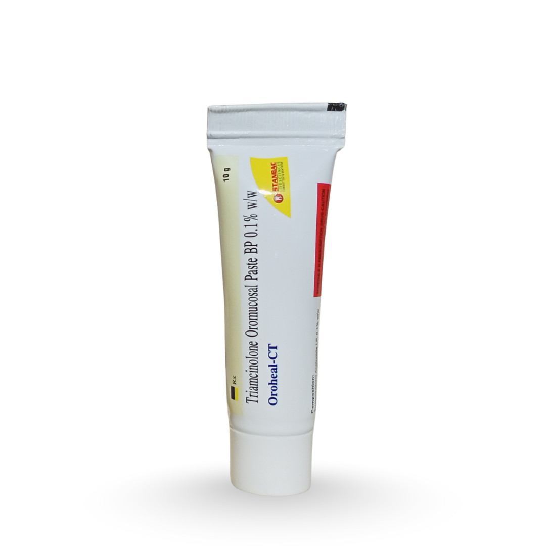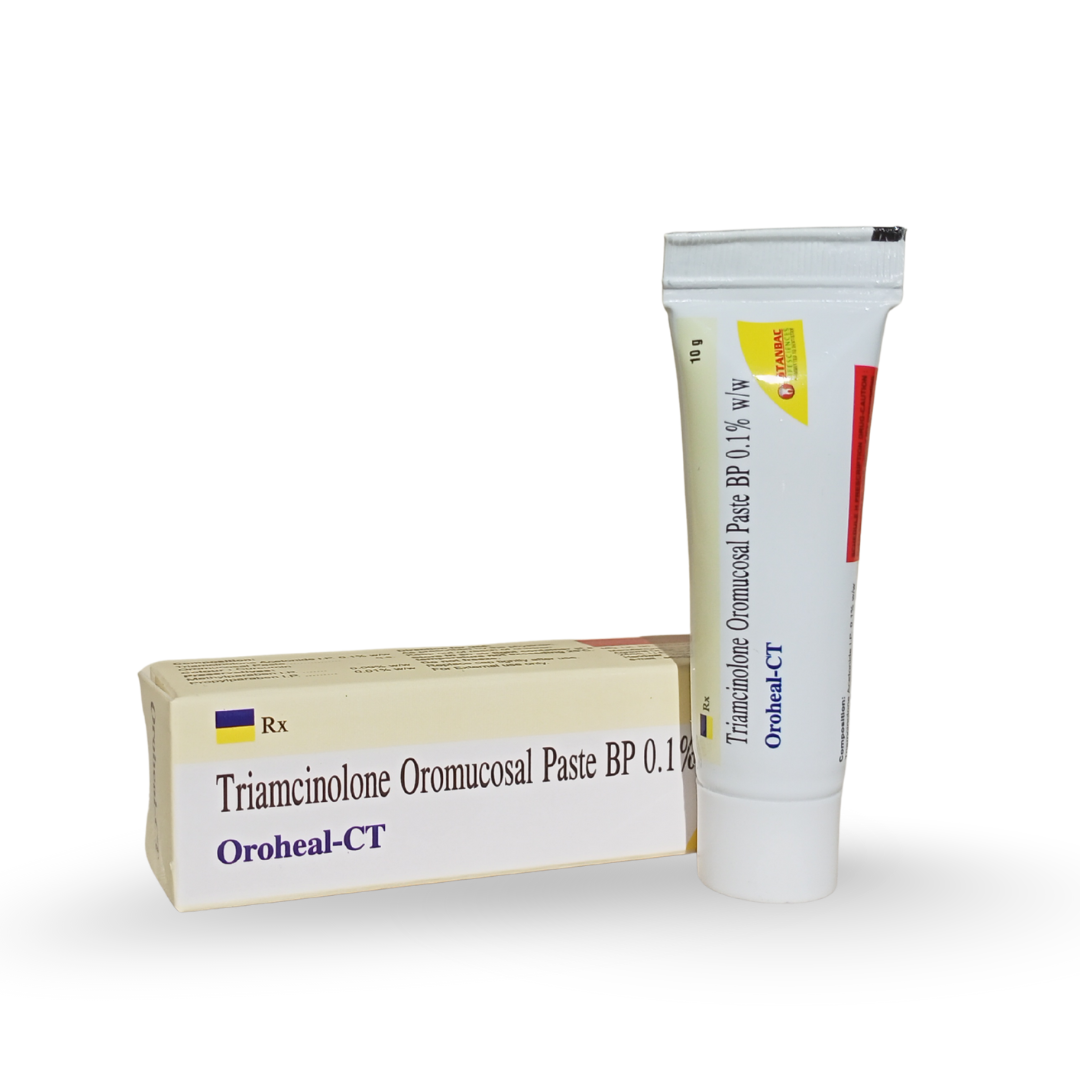 Oroheal-CT is a therapeutic oromucosal paste formulated with Triamcinolone Acetonide, a corticosteroid that helps reduce inflammation, redness, and ulceration inside the mouth. Its adhesive paste base allows prolonged contact with oral tissues, ensuring targeted relief.
